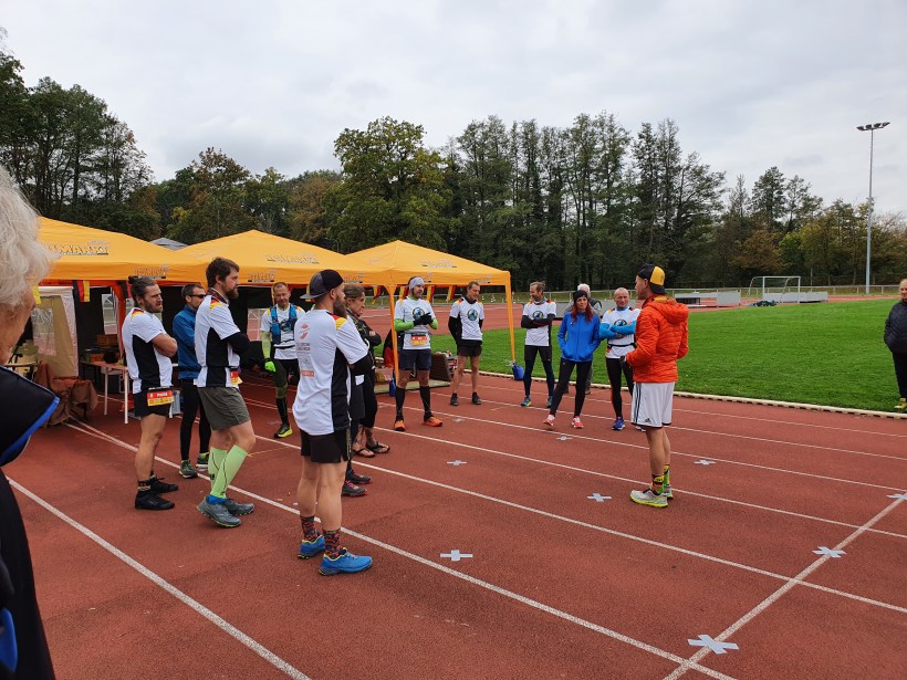 Kandel….12:00 Uhr… Highnoon…. Samstag 17.10. Mein Herzblättle Claudi und ich stürzen uns ins Geschehen und in ein Abenteuer mit ungewissem Ausgang. Den Pavillon und das Zelt hatte ich bereits am Freitagnachmittag mit Teamkollege Harald, Betreuern und Laufkollegen der LSG Karlsruhe aufgebaut, deshalb galt es jetzt nur noch das „Wohnzimmer“ für die nächsten Stunden…vielleicht Tage einzurichten. Zwischendurch begrüßten wir uns alle untereinander. Man sah schnell, dass die Stimmung zwischen allen Teilnehmern sehr gelöst und locker war. Ich kann zwar nur von meiner Seiter aus sprechen aber die Zusammenstellung des Teams Germany ist Michael Ohler sehr gut gelungen. Eine super Mischung aus sehr erfahrenen Ultraläufern/innen und der Motivation der Backyard Rookies. Auch das Zwischenmenschliche hat in unserer Truppe sehr gut gepasst. Die Zeit verging dann doch recht schnell und eh ich mich versah standen wir auch schon auf dem Rasen zum Gebet…. 😉
