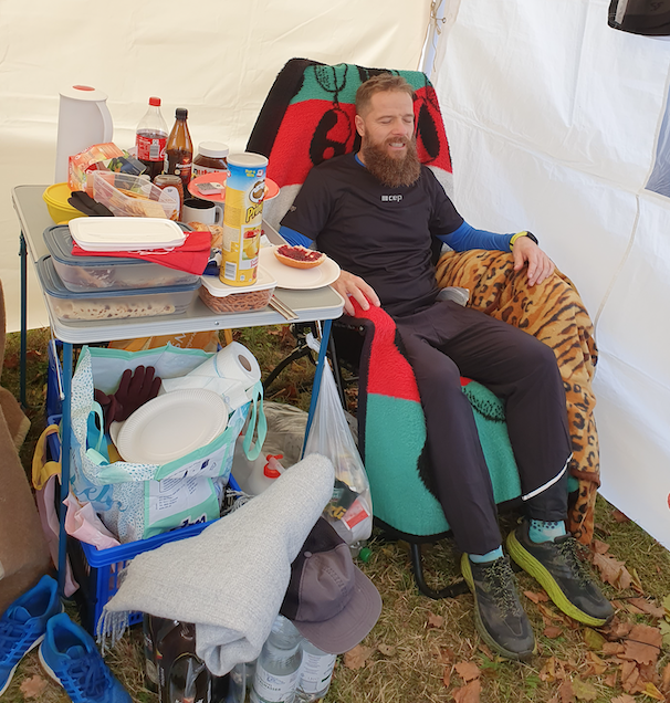 Mein Herzblättle Claudi sowie Peter und Anna kümmerten sich auch in der Nacht um Harald und mich. Das ist ein ein brutaler Job als Betreuer oder Betreuerin. Du hast im Prinzip 45 Minuten nix zu tun und dann muss innerhalb kurzer Zeit alles passen. Jeder Handgriff muss sitzen. Hat der Tee in der Nacht die richtige Temperatur? Liegt alles bereit was er braucht? Braucht er Zuspruch oder halte ich lieber die Klappe. Absoluten Respekt für alle Unterstützer/innen die uns Läufer/innen in Kandel supportet haben. Ohne euch ging das Ganze in der Form so nicht. Das ist auch das absolut geniale an diesem Laufformat. Man ist als Team am Start und jeder ist auf seine Weise wichtig. Ohne es herunter zu spielen aber wir Läufer/innen müssen eigentlich ja nur laufen, so blöd sich das anhört ist es im Backyard-Format fast noch das einfachste :-). Meine Claudi und ich sind in diesem Jahr 20 Jahre verheiratet und wir haben echt schon viel erlebt und durchgemacht aber das Ding in Kandel hat uns nach so langer Zeit sogar noch mehr zusammengeschweißt. Es ist doch geil was ein Hobby so alles bewirken kann.