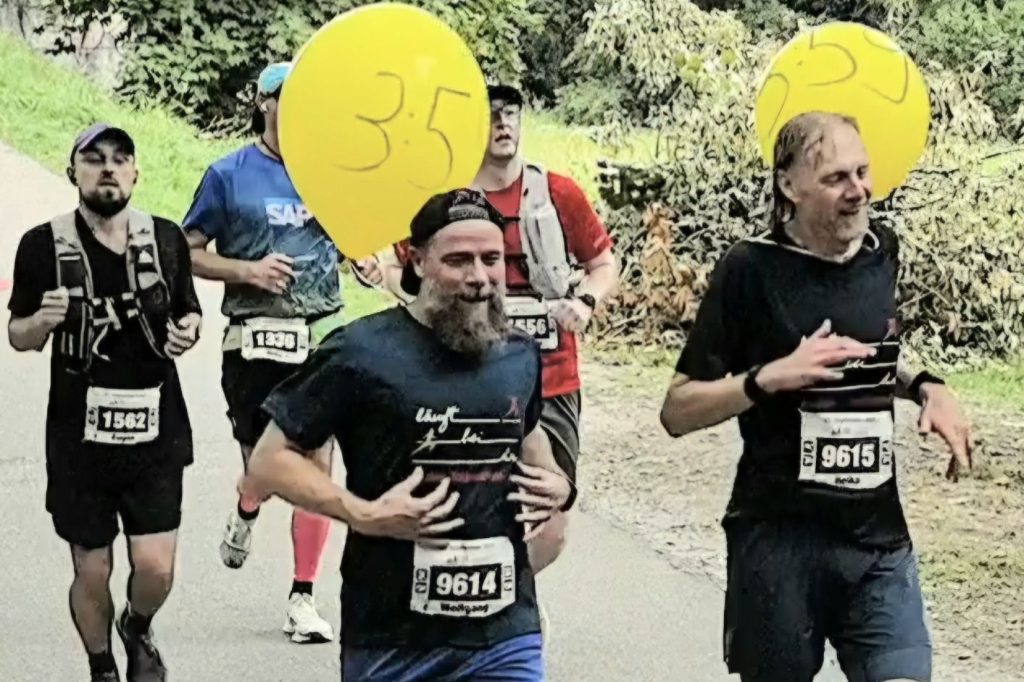 Großer gelber Ballon am Shirt. Zugläufer. 3:59 Stunden.